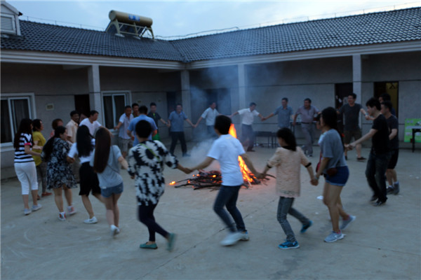 宁静安谧的乡间夜晚,吃完香喷喷的农家晚餐,篝火晚会在大家的期待中开始了,一群人,手拉着手围着篝火边跳边唱,开心极了。一首首昔日经典“小苹果”、“好日子”、“难忘今宵”……伴随着欢快的舞步引爆白马一日游活动最高潮,每一个人脸上洋溢着灿烂的笑容,大家的心也更近了。“我们是工作中的好伙伴,我们是相亲相爱的华瑞人。”
