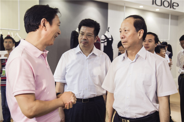 9 月 9 日, 服装节开幕式结束后, 江苏省省长石泰峰、 副省长马秋林, 在省、 市相关领导的陪同下参观了我司展厅, 与集团董事长康宜华亲切交流, 并对我司发展给予了肯定与赞赏。