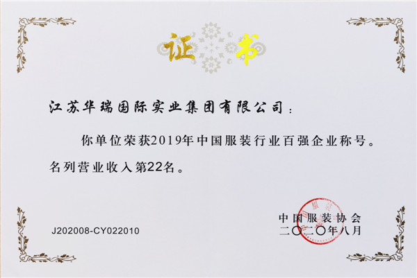 根据全国各省、自治区、直辖市服装行业协(商)会 等单位初审和推荐,中国服装协会对2019年中国服装 行业企业申报的“营业收入”、“利润总额”和“营业收入 利润率”资料进行审核,评选出了2019年服装行业百强 企业。华瑞国际集团荣获营业收入百强第22名、利润 总额百强第50名,可喜可贺!华瑞全体同仁将继续努 力,再创辉煌!