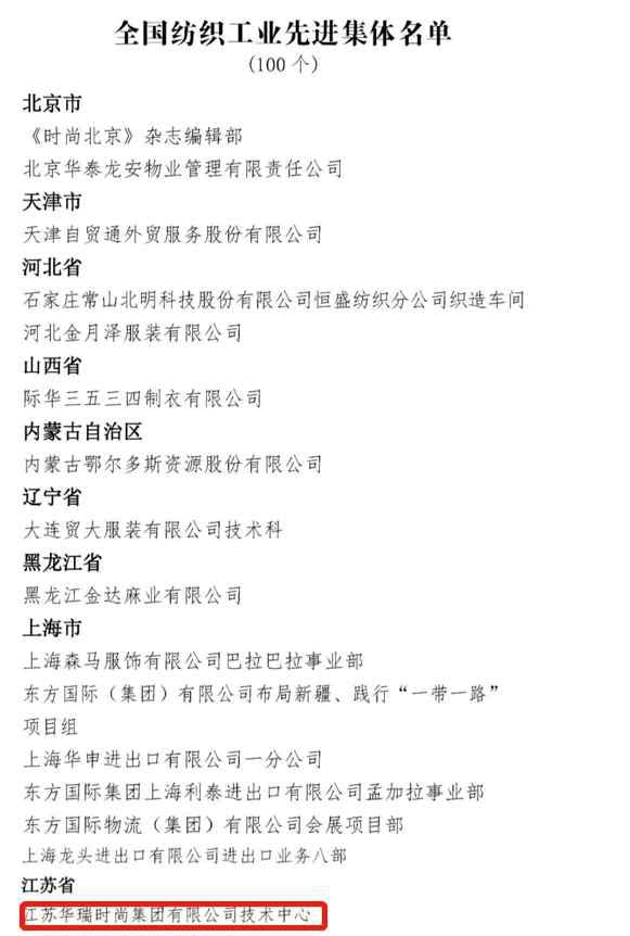 近日,国家人力资源社会保障部与中国纺织工业联合会联合发文,授予100个单位“全国纺织工业先进集体”荣誉称号,授予300余名同志“全国纺织工业劳动模范”、“全国纺织工业先进工作者”称号。祝贺我司技术中心荣膺“全国纺织工业先进集体”荣誉称号。