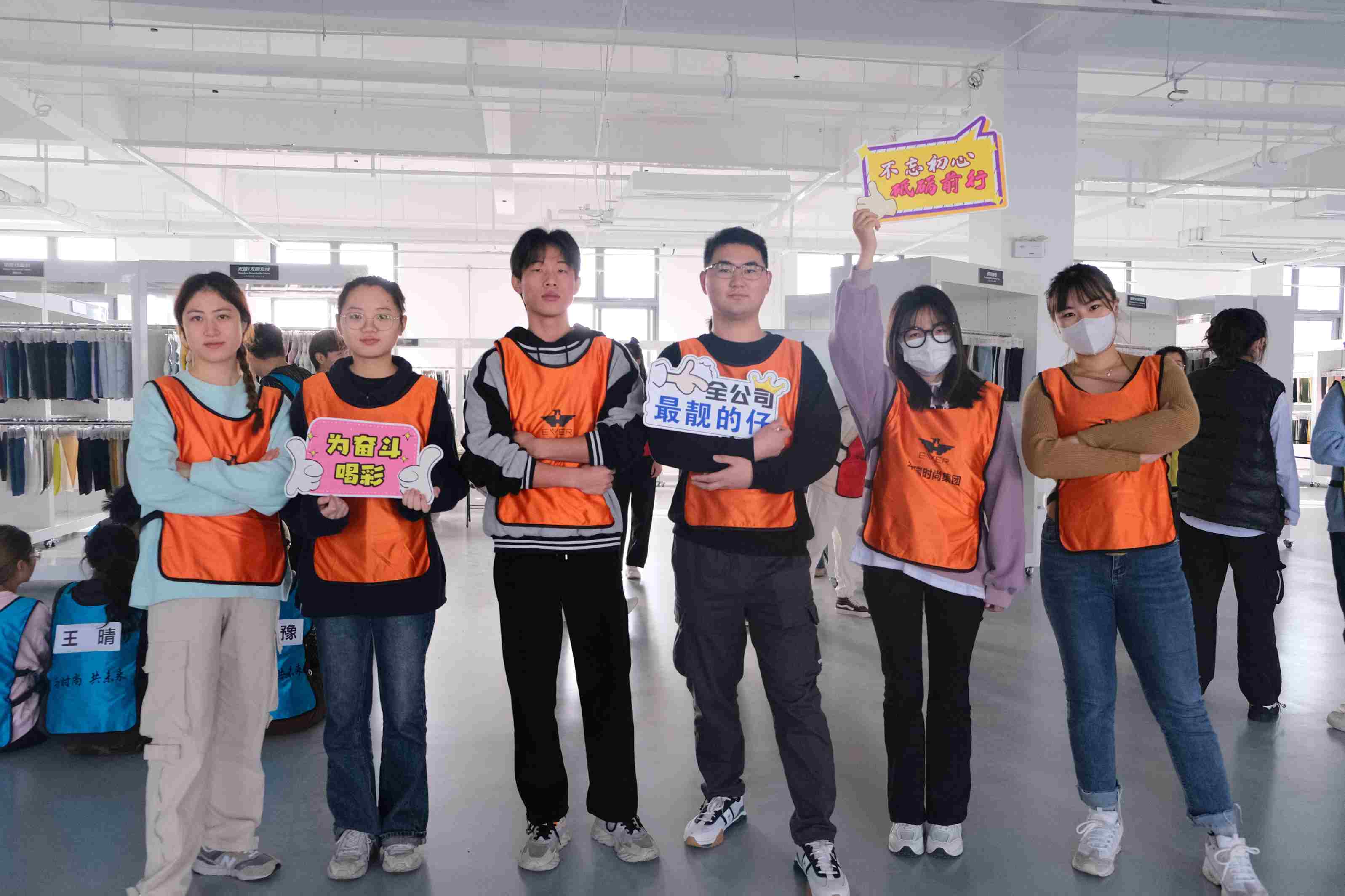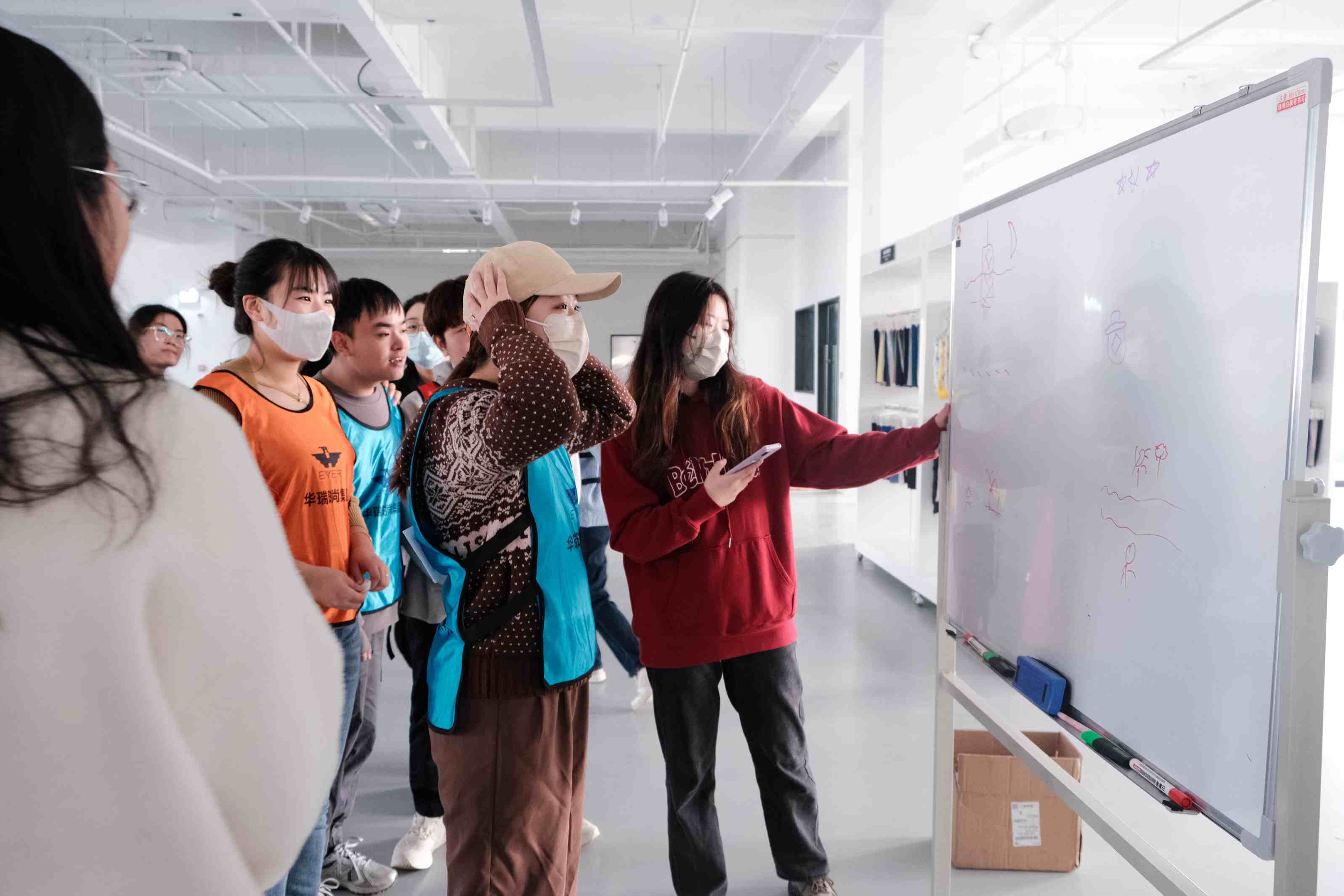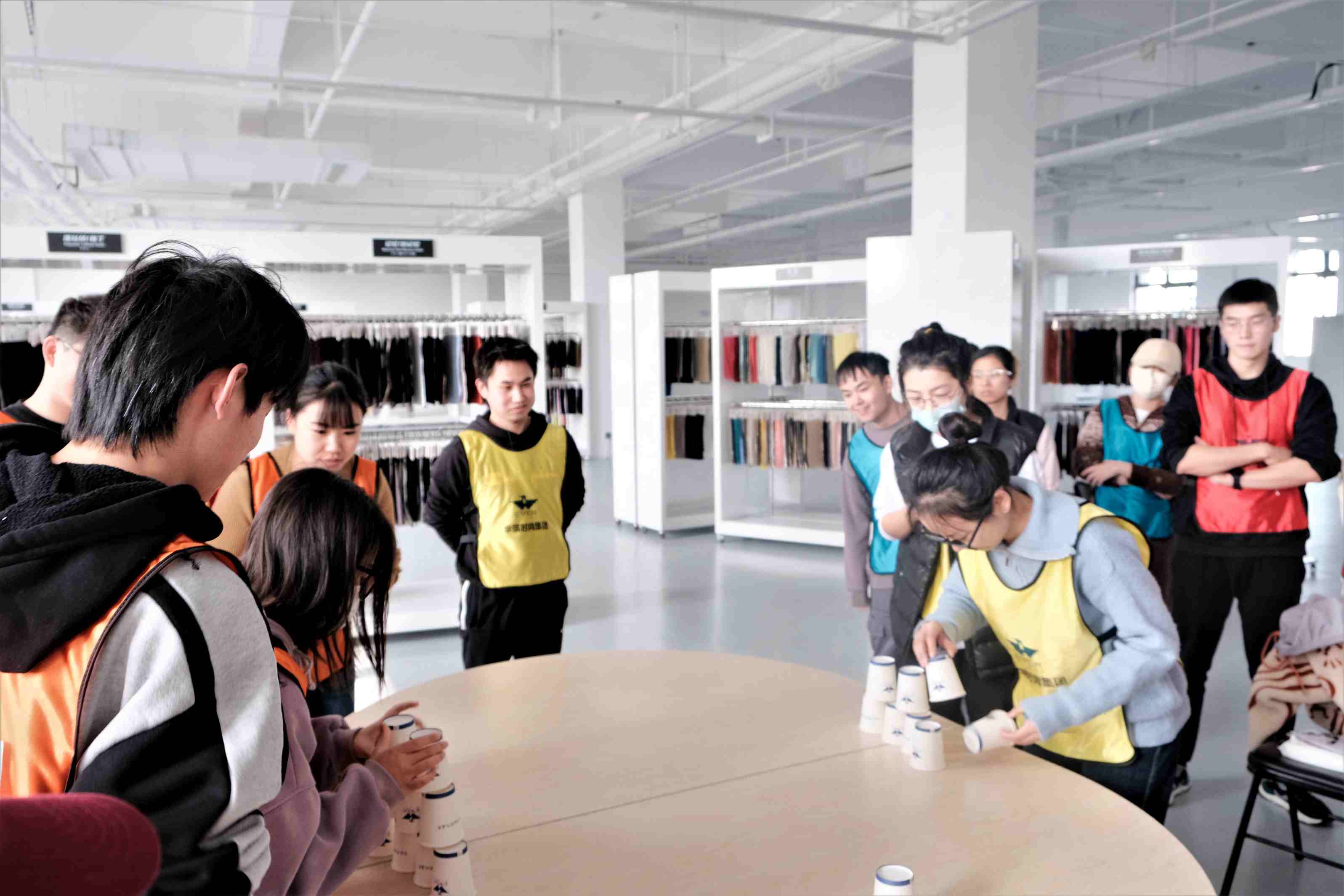 当天上午,大学生们齐聚九号楼面料开发中心,24名学生被分为红、蓝、黄、橙4个小组,此次团建活动主要是小组作战,考验团队的配合和默契,团队成员之间齐心协力,才能获得每轮游戏的战利品。