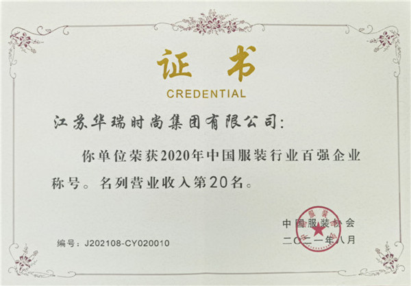 热烈祝贺华瑞时尚集团荣获“2020 年中国服装行业百强企业”称号